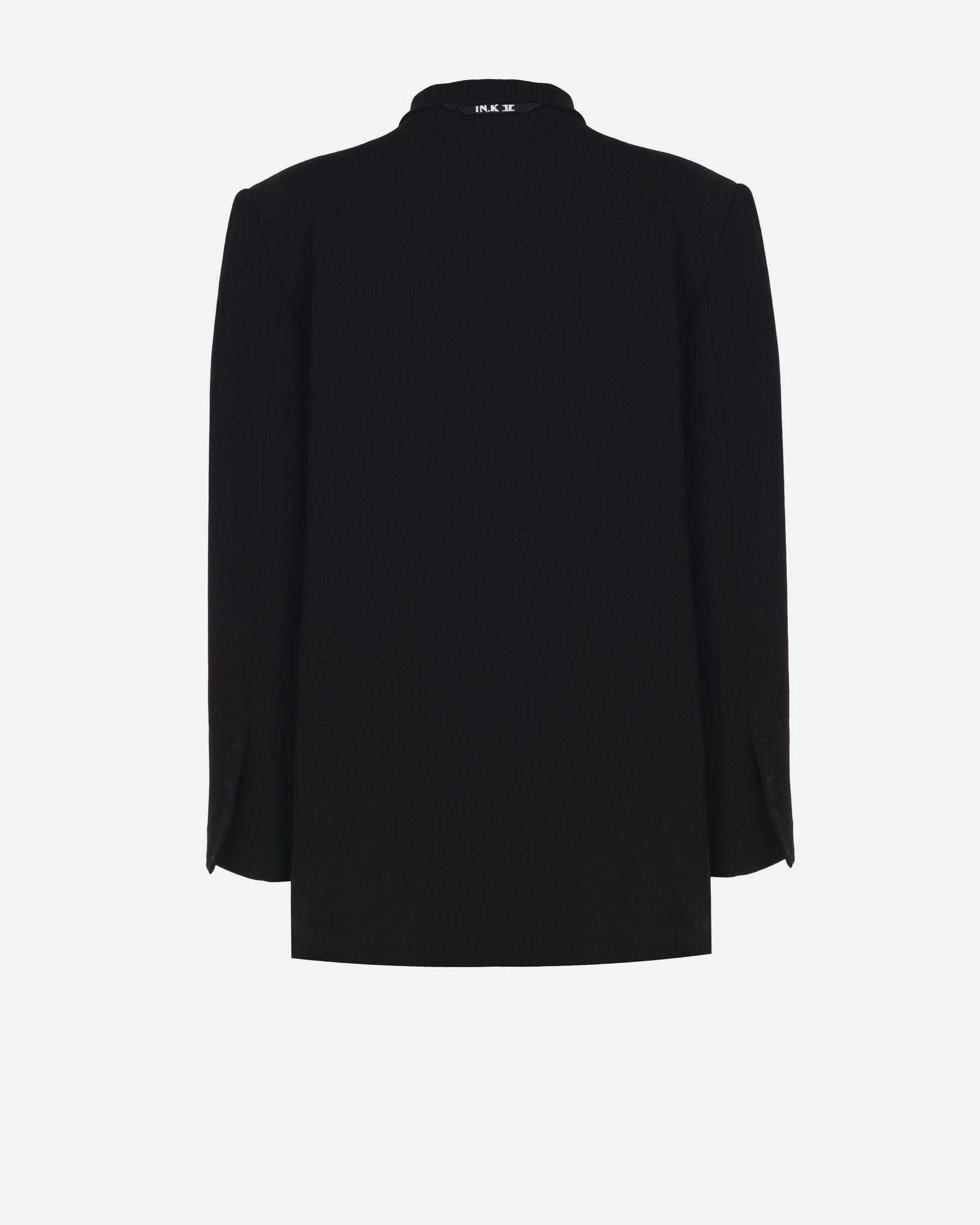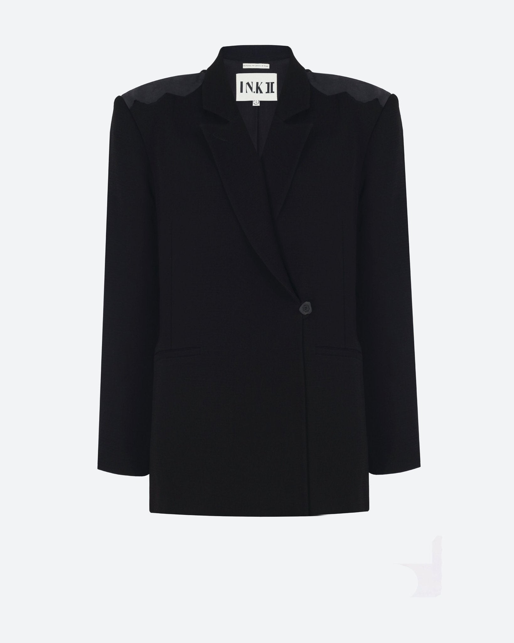 THE BLACK CROSSOVER BLAZER REDEFINES MODERN TAILORING. CRAFTED FROM A STRUCTURED FABRIC, IT HOLDS IT’S FORM WHILE MAINTAINING A RELAXED FIT. THE CROSSOVER FRONT CREATES A STRIKING YET MINIMAL SILHOUETTE, FASTENED WITH A SINGLE BUTTON. THE UNFINISHED SHOULDER DETAIL ADDS A RAW, DECONSTRUCTED TOUCH.